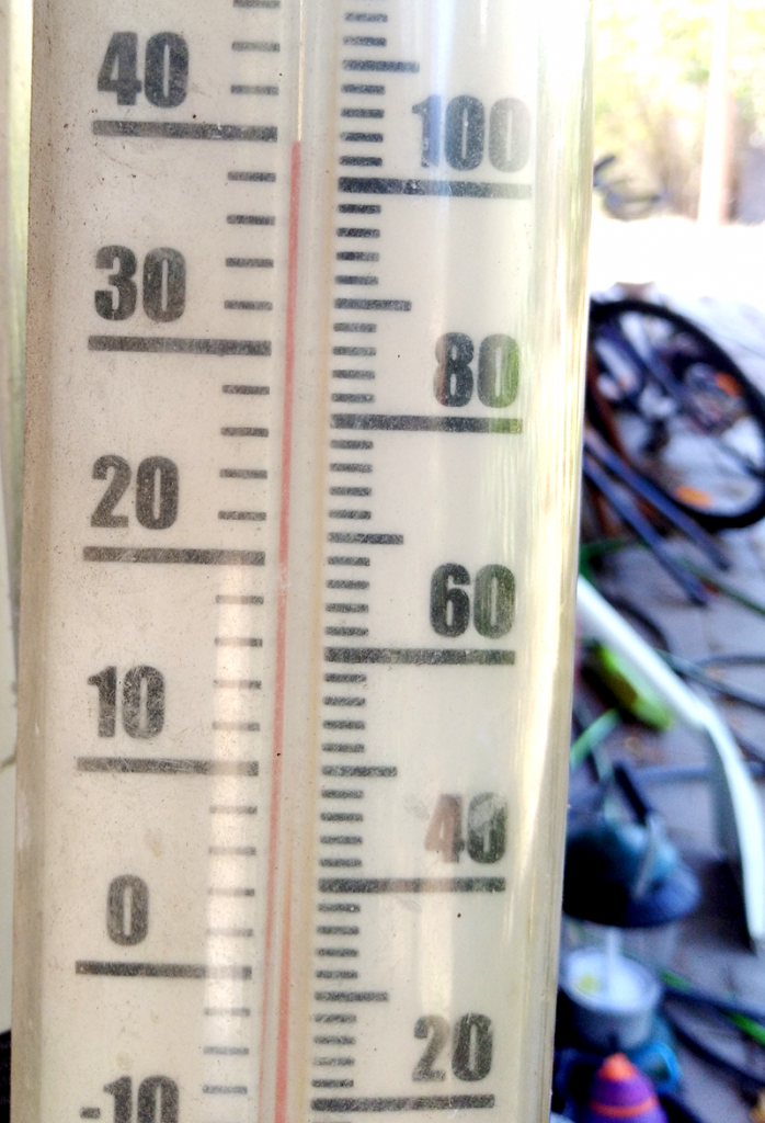 It nudged 40C in southern Tasmania yesterday. The thermometer pictured is in the shade at the cool east end of a Huon Valley house.